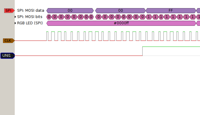Since this (rather simple) "protocol" is transmitted over SPI, the protocol decoder can make use of the stacking feature in libsigrokdecode and simply stack upon the spi decoder (thus avoiding having to re-implement all of the SPI handling in the RGB LED decoder itself).